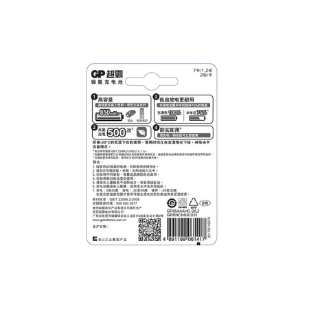超霸(GP)7号充电电池2粒装850毫安 镍氢电池 七号AA(GPRHCH83C031)