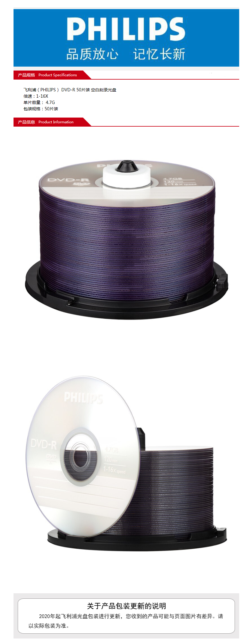 飞利浦(PHILIPS)DVD-R空白光盘/刻录盘 桶装50片