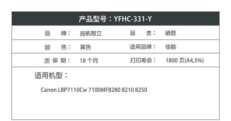 扬帆耐立331 黄色硒鼓 适用佳能LBP7110 7100 MF8280 8210-商专版