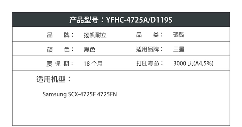 扬帆耐立4725 黑色硒鼓 适用于三星SCX-4725F 4725FN 4521HS 4521NS